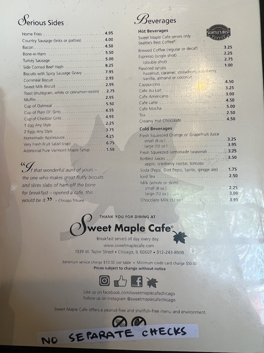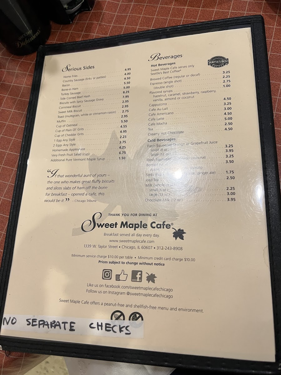 Welcome to Sweet Maple Cafe, a charming gem nestled at 1339 W Taylor St, Chicago. This intimate eatery offers a delightful breakfast experience that both warms the heart and pleases the palate. Renowned for its comforting menu, the cafe's standout dishes include the Be Creative omelette, with a perfect blend of eggs, veggies, and spices, and the legendary cinnamon roll pancakes, which have garnered rave reviews. Customers rave about the apple spice pancakes paired with sausage, and the refreshing freshly squeezed orange juice is an artful complement.
